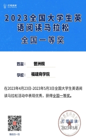 在为期10天(4月23日8点—5月3日8点)的2023全国大学生英语阅读马拉松活动中,我院学生积极参与,认真阅读答题,取得非常优异的成绩。其中,2020级商务英语专业曾洲桐同学获全国一等奖且排名第一,同样来自2020级商务英语专业的张婕和张雅龙同学获全国二等奖,来自2022级商务英语专业的程俊炜同学获全国三等奖。