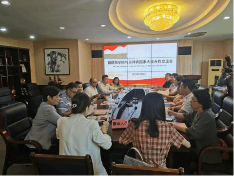 2023年8月27日下午,菲律宾国家大学校长Dr. Renato Carlos H.Ermita一行六人莅校交流,校长程灵、副校长萧罡、有关职能部门和二级学院相关负责人在马尾校区会见来宾,召开交流会。我院池玫院长出席交流会,教师周文蕴为菲律宾国家大学校长一行提供翻译语言服务。