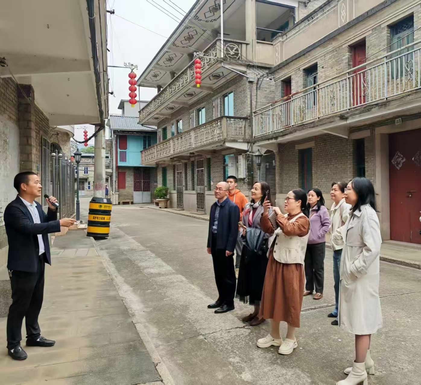 穿过长柄村的门牌坊,仿佛步入了时光隧道,一排排建于上世纪50年代的南洋风格骑楼赫然映入眼帘。这些融合了中西建筑美学的楼宇,虽历经风雨,其精致的雕花与独特的拱廊依然在无声地诉说着先侨们远涉重洋、艰苦创业而后反哺桑梓的辉煌往事。老师们穿行其中,无不感受到扑面而来的历史厚重感与跨越山海的家国情怀。