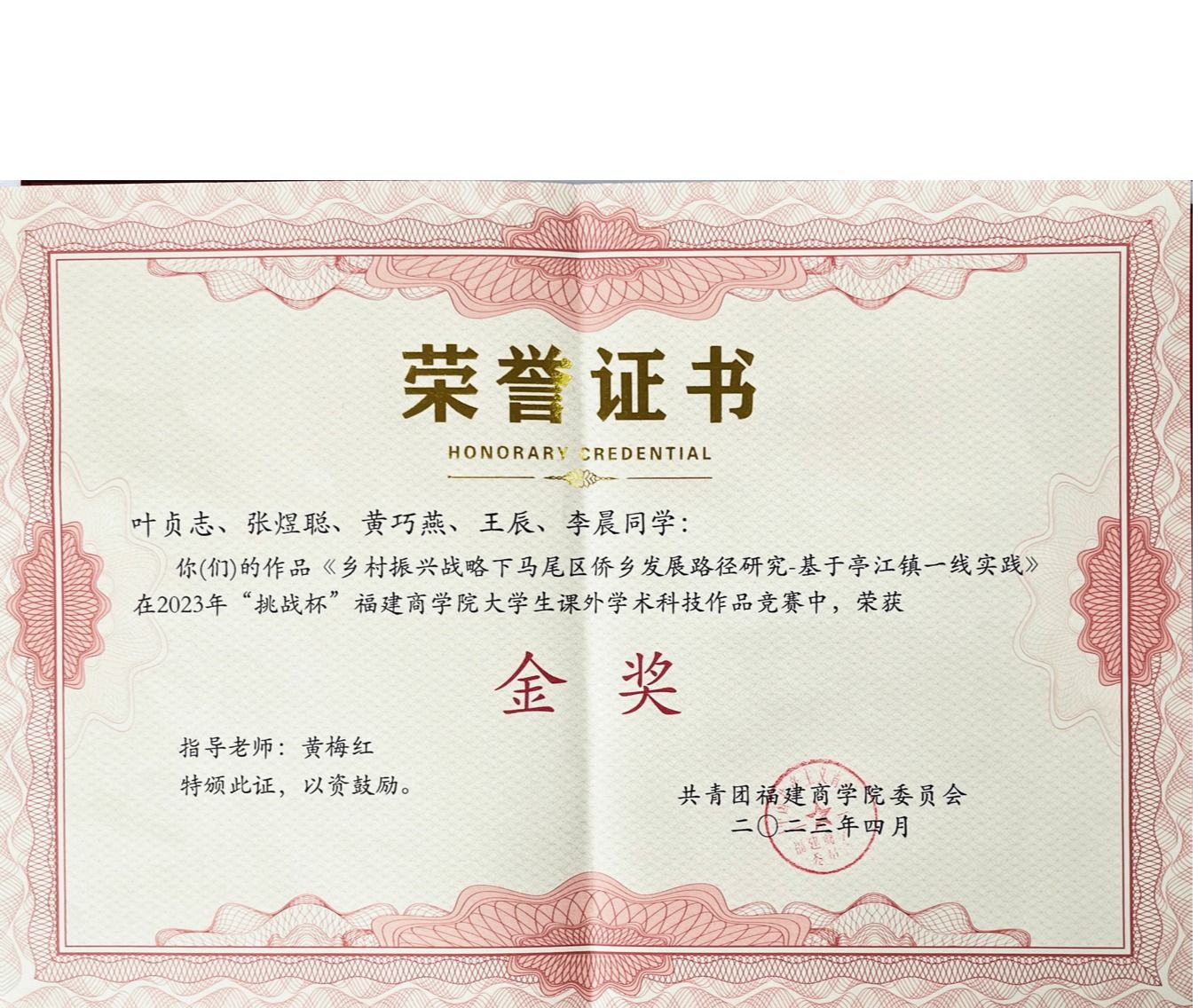近日,由共青团OK138太阳集团委员会主办的2023年“挑战杯”OK138太阳集团大学生课外学术科技作品竞赛在连江校区明德楼落下帷幕。我院21级日语3班叶贞志、21级日语2班张煜聪、20级日语2班黄巧燕、20级日语1班王辰、20级商务英语2班李晨五位同学的作品《乡村振兴战略下马尾区侨乡发展路径研究-基于亭江镇一线实践》(指导老师:黄梅红),在此次竞赛中荣获金奖。