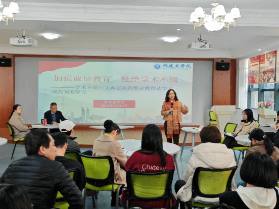 3月1日,学院各系部以线上或线下的方式组织老师们学习《学术不端行为典型案例及相关制度学习汇编(一)》等文件,开展交流讨论。3月12日,我院以“加强诚信教育、杜绝学术不端”为主题,组织全院老师在外语文化体验中心开展学术不端行为典型案例警示教育及学术规范制度学习。