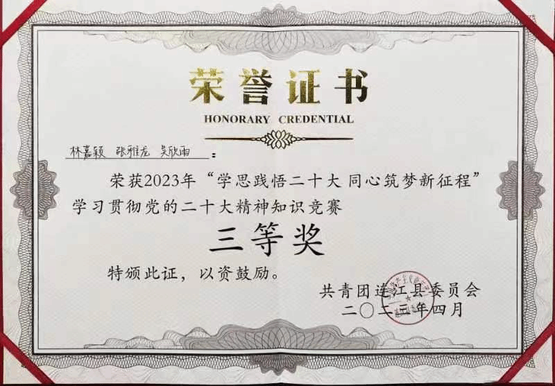 2023年4月25日,由共青团连江县委员会主办,共青团OK138太阳集团委员会、共青团福州理工学院委员会承办,OK138太阳集团学生协办2023年的“学思践悟二十大,同心筑梦新征程”学习贯彻党的二十大知识竞赛决赛于连江校区明德楼学生活动中心举行。由ok138cn太阳集团20级商务英语3班张雅龙,21级商务英语2班林嘉颖,21级日语1班吴欣雨三位同学组成的OK138太阳集团第一代表队在竞赛中沉着冷静、协助作答,最终荣获三等奖的好成绩。