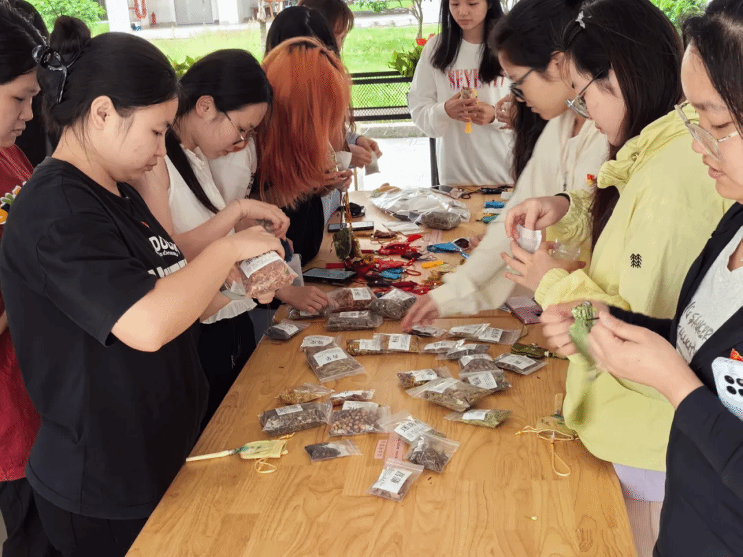 本次活动设书法展示区、香囊制作区、五彩绳编制区。在香囊制作过程中,同学们精心挑选材料,将栀子、陈皮等药材装入锦囊,针线穿梭间,一个个寓意"前程似锦"的毕业礼物逐渐成型。学生第二党支部书记刘思怡手持绣有"安康"字样的香囊,向在场的毕业生党员生动讲解端午佩香传统:“艾叶驱邪、薰衣宁神,这小小香囊承载着千年的健康祈愿”。香囊作为端午文化传承的载体,恰逢毕业季,成了传递美好祝愿的媒介。