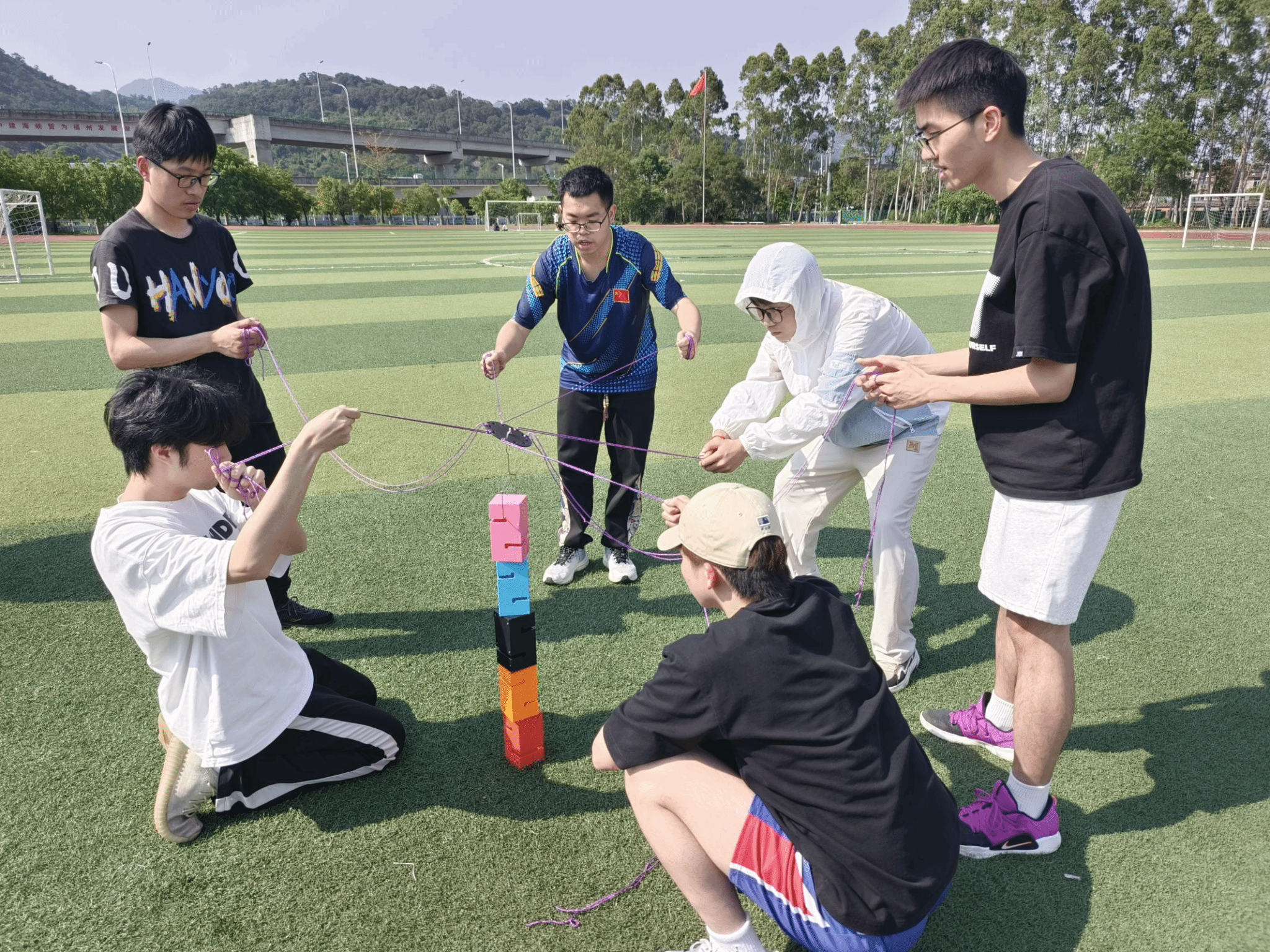 本次运动会共设足球接龙、珠行万里、合力建塔、沙包投掷、一圈到底五个项目,每个项目都需要挑战团队的默契配合与齐心协力。赛场上,同学们团结一心、奋勇拼搏。有的选手技巧娴熟,动作流畅,引得观众阵阵喝彩;有的选手虽偶有失误,但立刻调整状态,重振旗鼓,展现出了坚韧不拔的精神。在合力建塔项目中,所有队员一起拉紧绳头,用钩子小心翼翼地吊起盒子,朝着指定位置移动。在搭建“塔”的过程中,“塔”常常因受力不均而倒塌,但队员们不慌不忙,没有丝毫抱怨和气馁,而是迅速调整策略,再次尝试,充分体现了团队的凝聚力。大家紧密配合,相互鼓励,始终坚持“友谊第一,比赛第二的”高尚体育精神,现场气氛紧张而热烈。