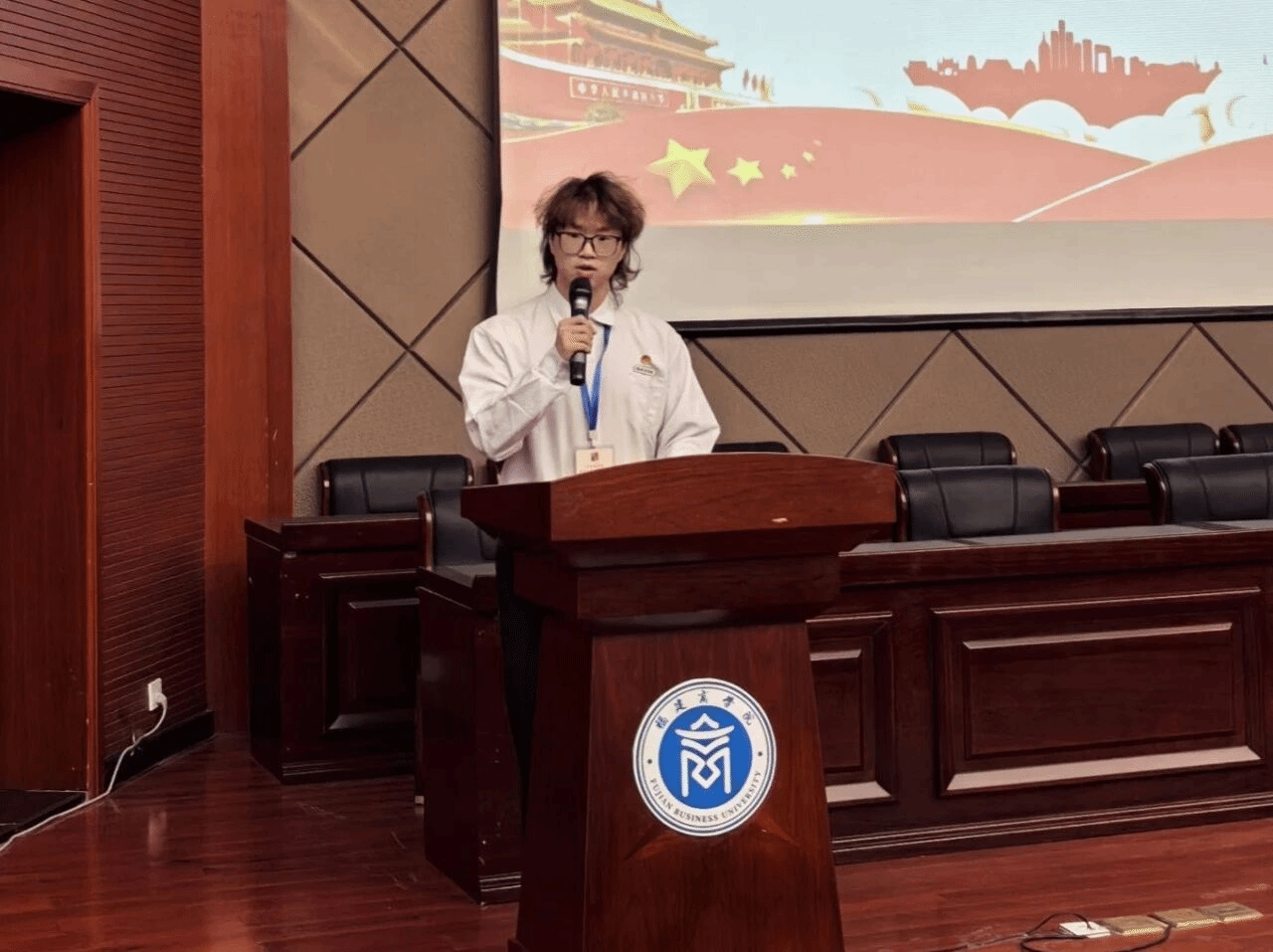 图3学生会主席团成员齐炜涵做学生会工作报告
