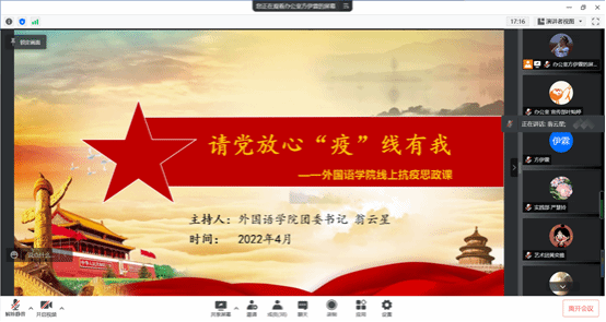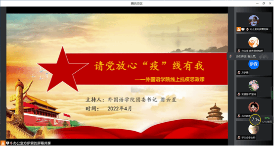 为学习贯彻落实习近平总书记关于疫情防控工作的重要指示批示精神,2022年4月7日,ok138cn太阳集团于线上开展了“请党放心‘疫’线有我”抗疫思政课。本次思政课由学院团委书记翁云星老师主讲,学院全体青年学生干部参加学习。